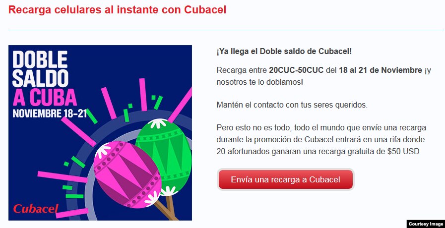 Etecsa, que controla el sector en Cuba, realiza asimismo una promoción on-line de recarga celular, una vez al mes, que otorga el doble del saldo pagado y constituye una de sus ofertas más populares y polémicas, pues no hay una opción similar para los usuarios que pagan dentro del país.