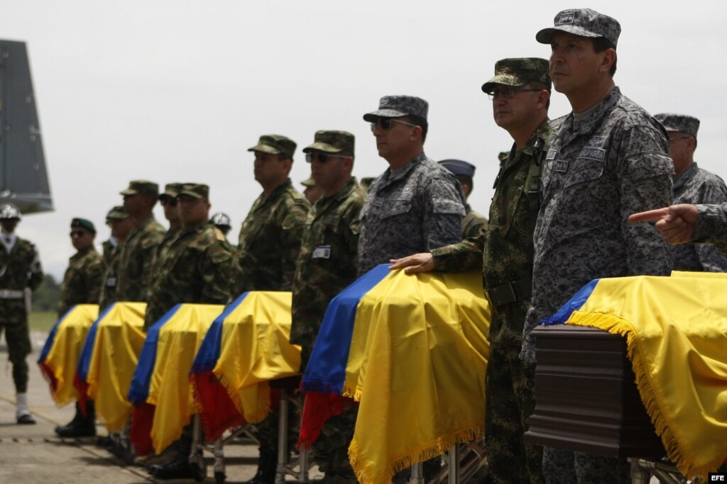 Soldados colombianos permanecen junto a los féretros de soldados muertos en un ataque de la guerrilla comunista de las FARC en zona rural del municipio de Timba, departamento del Cauca.