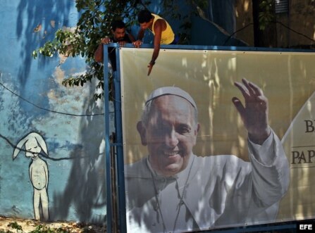 Vista tomada hoy, lunes 14 de septiembre de 2015, de una imagen del papa Francisco en la Plaza de la Revolución de La Habana (Cuba), donde el próximo 20 de septiembre oficiará una misa durante su visita pastoral a Cuba.