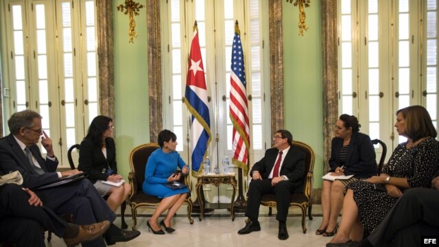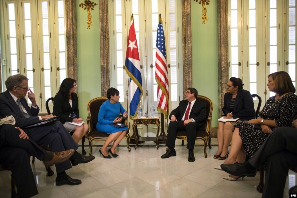 La secretaria de Comercio de Estados Unidos, Penny Pritzker (3-i), se reúne con el ministro cubano de Relaciones Exteriores, Bruno Rodríguez (3-d),