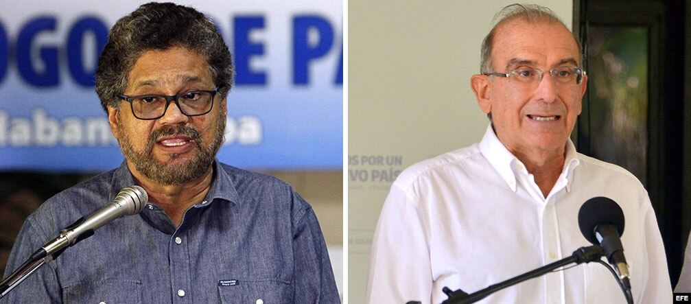 El jefe negociador de Colombia Humberto De la Calle (i) y el representante de las FARC el Iván Márquez. EFE