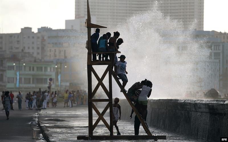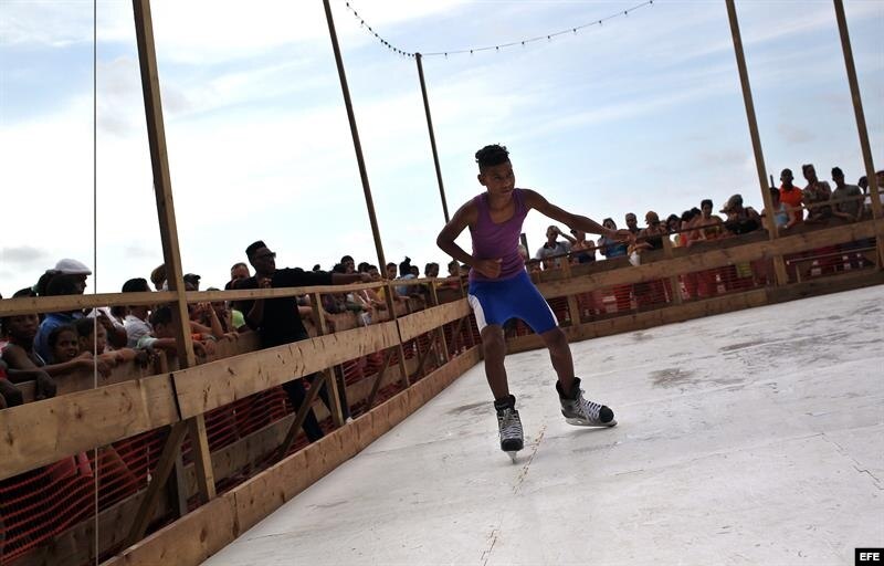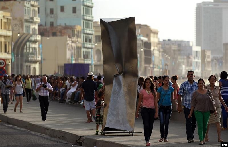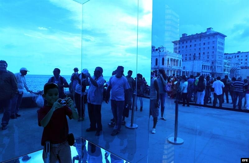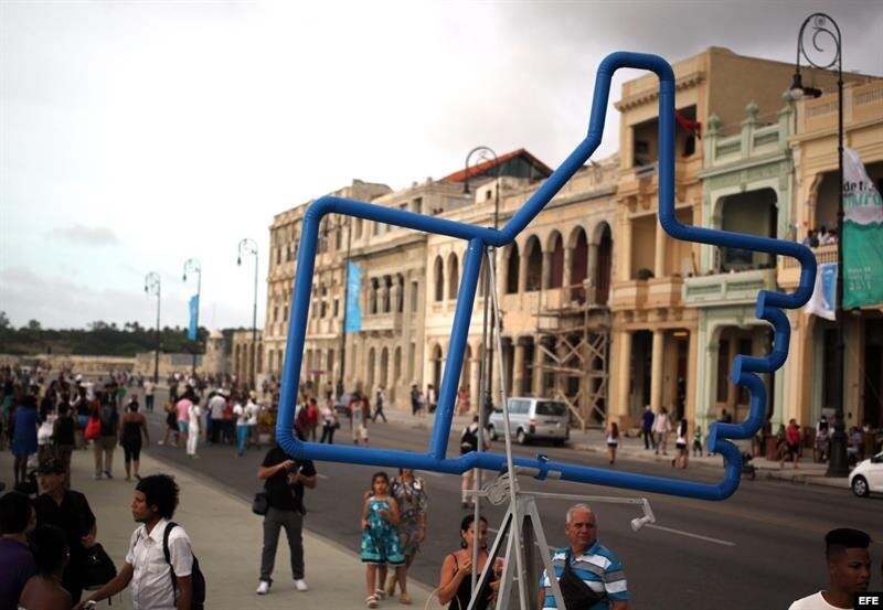 Los habaneros, turistas y los numerosos extranjeros que visitan estos días la isla con motivo de la Bienal pudieron este domingo disfrutar de un Malecón cortado al tráfico e inundado de sugerentes propuestas artísticas como una pista de patinaje sobre hielo pero sin hielo, una playa artificial o un sugerente gran cubo azul para apreciar la realidad con otro color.