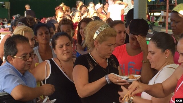 Cubanos reciben alimentos en una escuela del cantón La Cruz, convertida en albergue para dar refugio temporal a los migrantes varados entre la frontera de Costa Rica y Nicaragua.