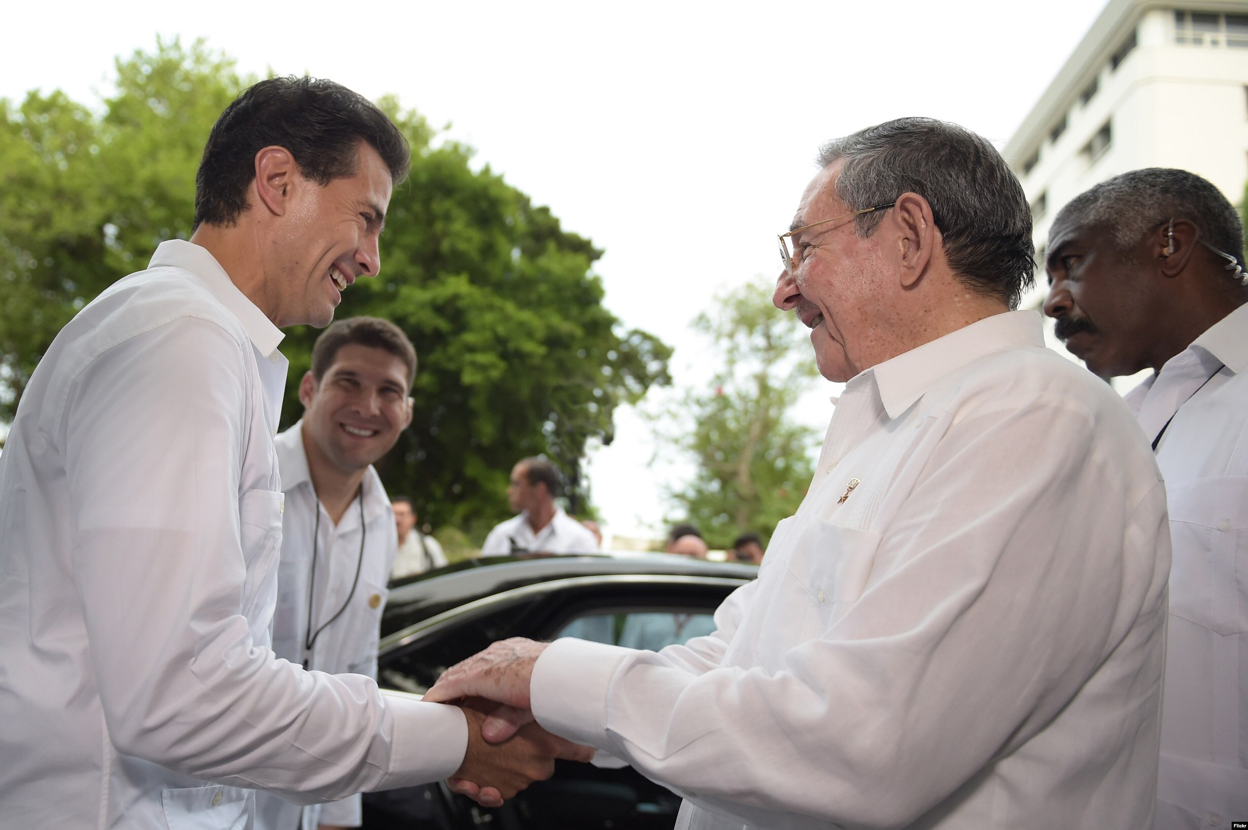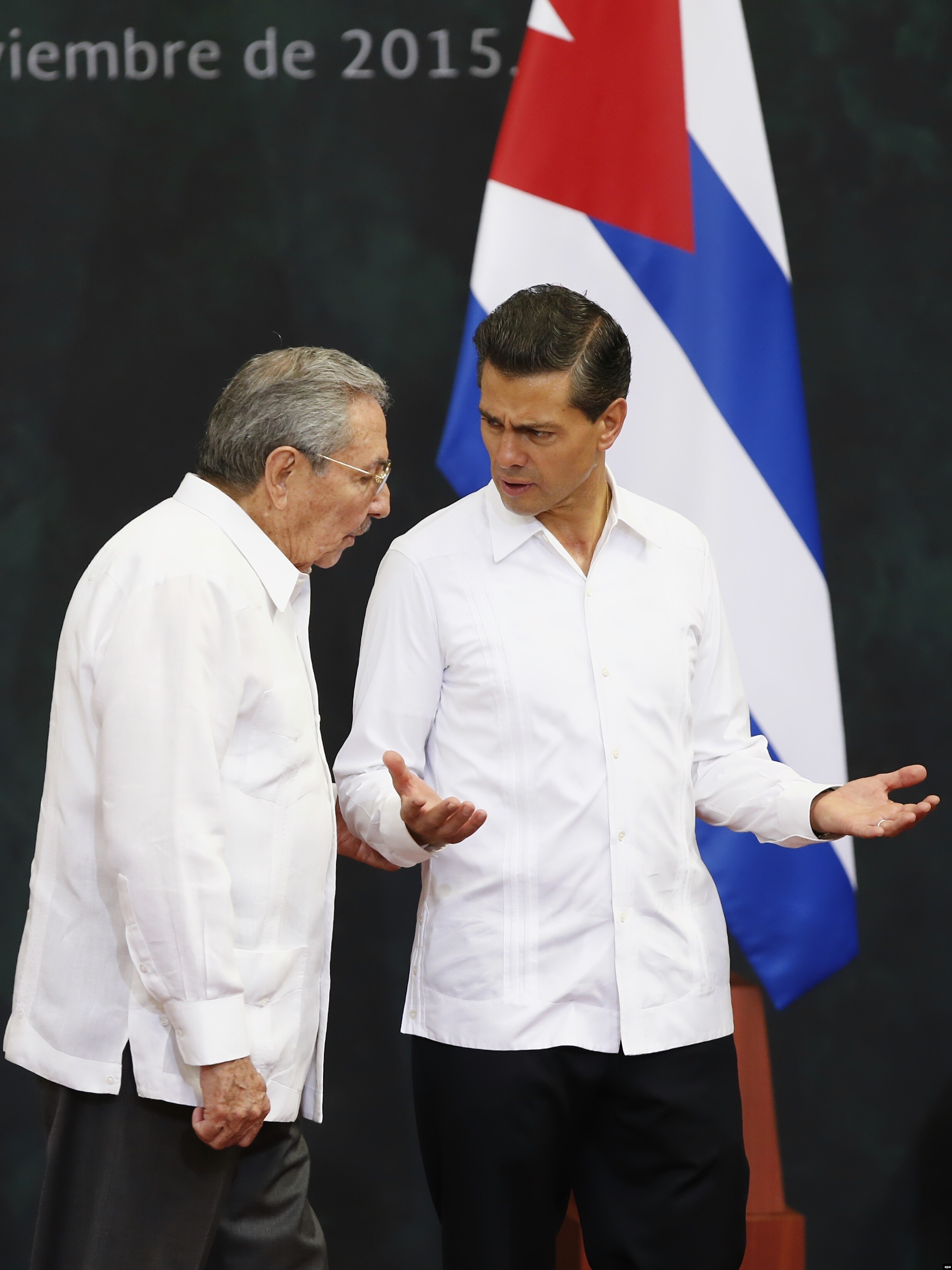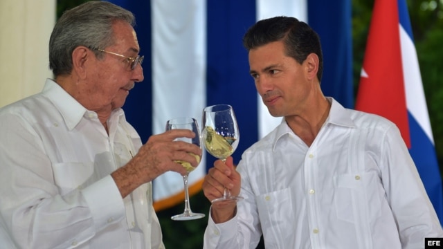 El presidente de México Enrique Peña Nieto y su homólogo cubano, Raúl Castro, brindan tras una rueda de prensa conjunta.