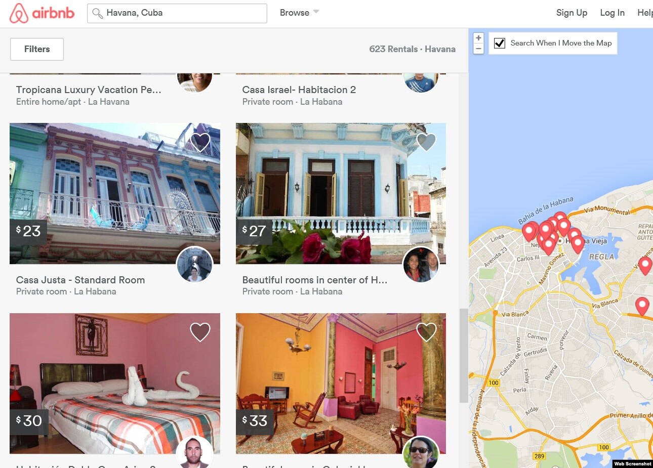 En la actualidad sólo los estadounidenses tienen acceso al servicio online de alojamiento en casas particulares en Cuba de Airbnb. Normalmente en Cuba una habitación cuesta un promedio de 25 dólares diarios y en ese caso Airbnb ha elevado el precio a 30 dólares para hacer frente a las tasas de cambio imperantes en la isla.
