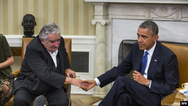 El expresidente de Uruguay José Mújica estrecha la mano del presidente de Estados Unidos Barack Obama (i-d), en la Casa Blanca. Archivo.