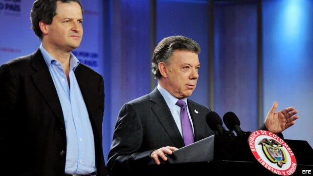 El presidente de Colombia, Juan Manuel Santos junto al Alto Comisionado para la Paz, Sergio Jaramillo, antes de que parta a La Habana. EFE